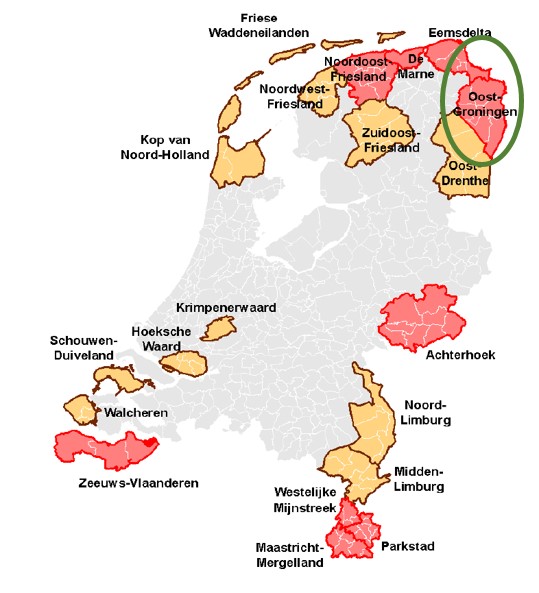 East Groningen is situated in the province of Groningen which is the north eastern most province of The Netherlands. It is a predominantly rural region, with a number of small villages and three regional centres (Veendam, Stadskanaal, Winschoten). Similar to the other study areas, the population of East Groningen is largely dependent on nearby regional centres, such as the City of Groningen. It has been formally labelled as a ‘population decline area’ as a result of both ageing and outmigration of younger adults who move to nearby urban areas for employment and education. This has subsequently also resulted in regional unemployment being higher than the national average.
